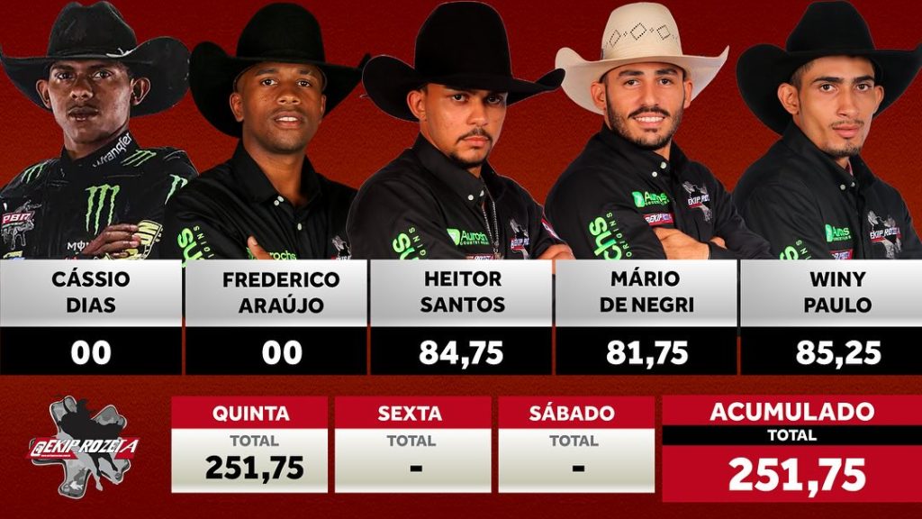 Rafael Ribeiro: Experiente, em eventos como este, competidores como Rafael Ribeiro são fundamentais. Ele não só fez seu papel pelo time como já desponta como um dos favoritos ao título individual. Marcou 88,00 pontos montando “Thunder”, da Cia. Marcelo de Castro, e já garantiu R$ 1.250,00 pela melhor nota. Rafael é campeão de Barretos, CRP, Colorado, entre outros títulos importantes.