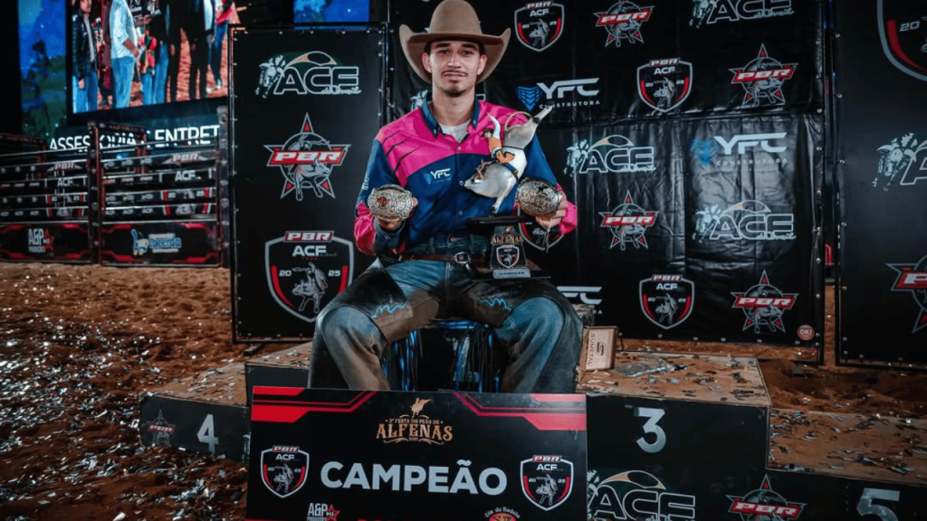Com apenas 18 anos, Guilherme Silveira, de Leme/SP, foi o grande campeão da etapa em Alfenas. Ele já carrega uma história de vitórias e conquistas. A paixão pelo rodeio começou cedo: aos 10 anos, montando em bezerro. Dos 14 aos 16, enfrentou garrotes, até chegar ao rodeio profissional.