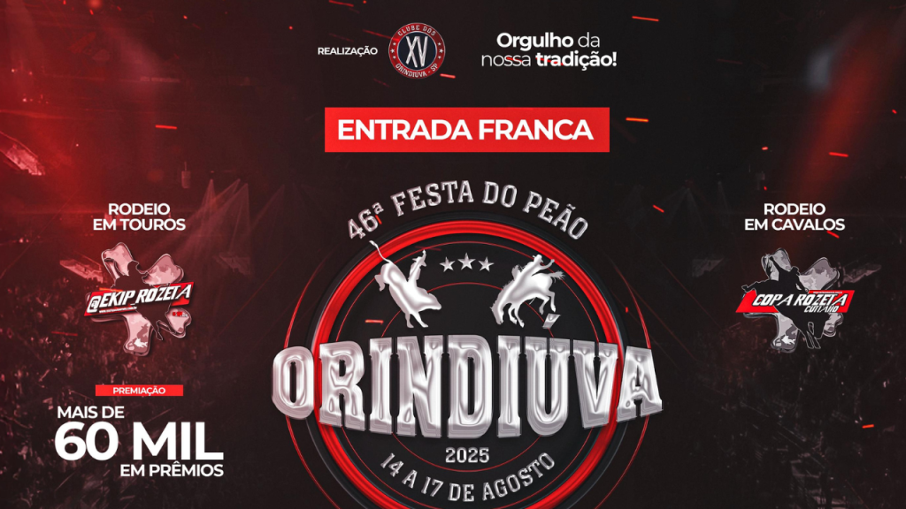 Acontece nesta semana a 46ª Festa do Peão de Orindiúva/SP, entre os dias 14 e 17 de agosto. O evento é uma realização do Clube dos XV, que tem como presidente Guilherme Ferreira Barbosa, com apoio da Prefeitura Municipal, governada pela prefeita Mireli Leite Ruvieri Martins, da Câmara Municipal, presidida por Rafael Guilherme Rodrigues Dias, e do Grupo Exclusiva.