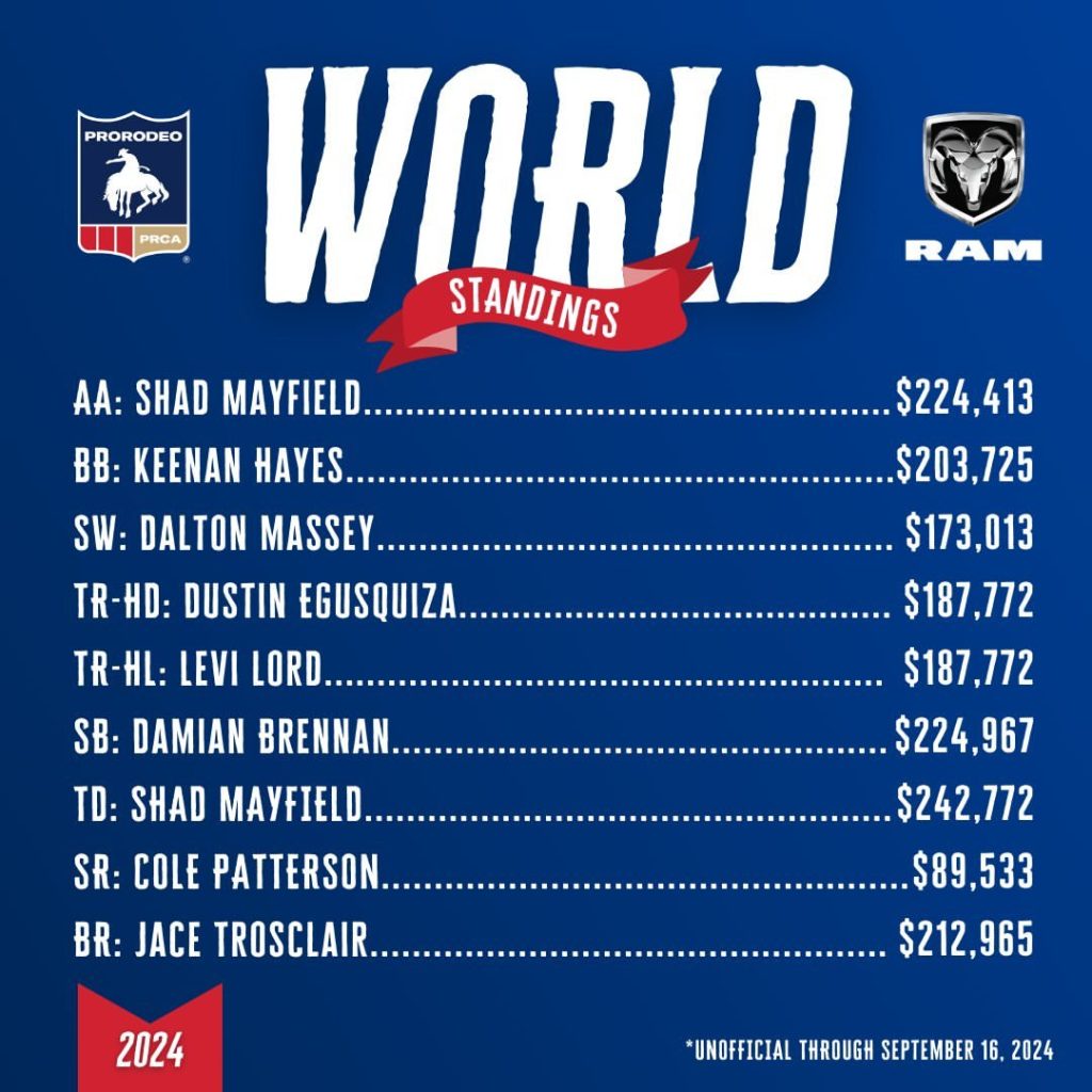 Já no Team Roping, Junior Nogueira, se mantem em segundo lugar, porém, com os bons resultados em Pendleton onde faturou aproximadamente 12 mil dólares, ele encostou mais no líder, estando agora 12 mil dólares atrás.